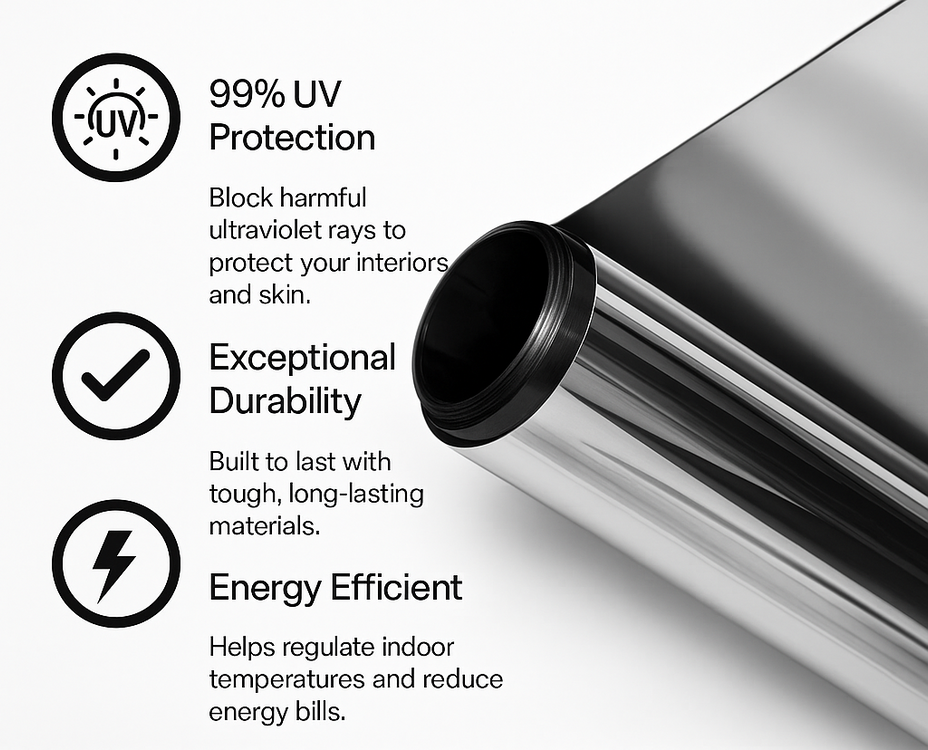 Most customers see a 15-25% reduction in cooling costs during hot months. Our film blocks up to 99% of UV rays and significantly reduces heat buildup, meaning your air conditioning doesn't have to work as hard. Many customers report the film pays for itself within the first year through energy savings alone.